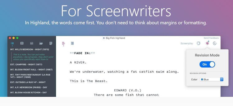 Highland 2 is a writing software designed to help screenwriters, novelists, and other writers automatically generate dialogues, recognize scene headers, suggest character and location names, and view a preview of what's been written. It lets university students automatically number notes, link multiple reference notes to the same value, add custom graphics or logs by simply dragging images to documents.