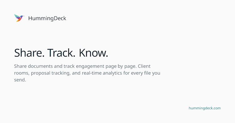 HummingDeck is a digital sales room and document sharing solution that enables organizations to distribute business content through tracked links while capturing granular engagement analytics. The platform consolidates documents, videos, links and embedded content into unified deal rooms accessible via a single URL. This design allows experienced professionals to monitor recipient behavior at the page level and to receive real time notifications when shared materials are accessed. The software addresses the needs of sales, marketing, agency, human resources and mergers and acquisitions functions that require detailed visibility into stakeholder interactions.