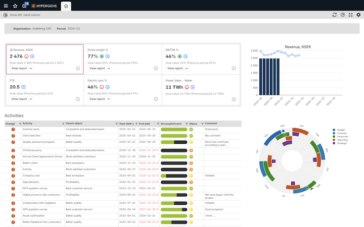 The platform's strategic planning capabilities allow users to digitize business planning and follow-up. The budgeting and forecasting module enables changes, quality assurance, and streamlining of budget and forecast work, while the analysis and insights component delivers the right information to the right people, facilitating informed decisions. Hypergene's performance reporting functionality helps compile and distribute recurring reports, and the integrated KPI tracking capabilities provide a self-service approach to monitoring key performance indicators.