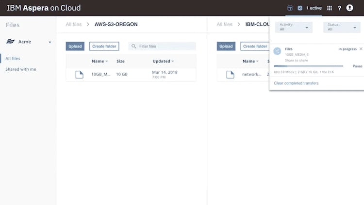 IBM Aspera on Cloud enables organizations to securely share data sets of any size at maximum speeds. With built-in security features, it allows teams across shared workspaces to collaborate while keeping data secure. IBM Aspera on Cloud can be used to transfer data between users regardless of network conditions or distance.