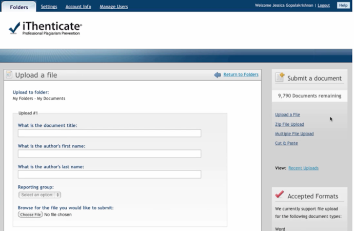 iThenticate by Turnitin is a plagiarism checker tool for academic institutions, researchers, and publishers. It can find similarities in written content when compared to top-cited journals and other online sources. iThenticate supports file upload in multiple formats, including DOC, DOCX, PDF, plus others. Documents can be uploaded as a single file or compressed zip file for larger uploads.