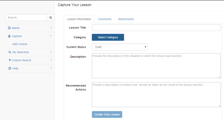 Lessons Learned Database allows users to capture knowledge via online forms, in which users can enter a lesson description, title and recommended actions, as well as add comments and attachments. To help ensure data quality, Lessons Learned Database supports content validation through a review process. Categorization and search tools allow users to sort and filter lessons. Multiple filters including keywords, categories, events, and dates assist users in locating lessons.