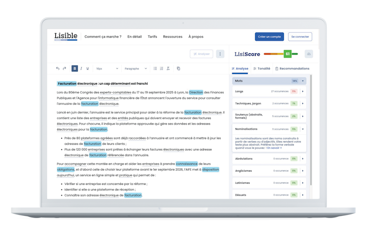 The software features a suite of analytical tools that operate in real time. A core component is the Lisiscore, a readability score that ranges from zero to one hundred and evaluates content based on seventeen research validated criteria tailored to the French language. Lisible automatically identifies complex words and phrases that may impede comprehension and analyzes the emotional tone and sentiment conveyed by the text. Contextual rewriting suggestions are provided for difficult passages along with personalized recommendations that simulate expert reviewer feedback. The platform supports the analysis of emails, web pages, administrative documents, and articles. A trial period allows three free analyses without an account followed by a seven day trial that does not require credit card information.