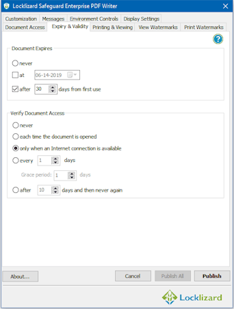 Safeguard PDF Security enables companies to share and sell PDF files securely. Protect high value sensitive and confidential information from unauthorized access and misuse. Control what authorized users can do with your documents - stop sharing, stop editing, stop copying, stop or limit printing, stop screen grabbing, control expiry, track and log user activity, instantly revoke access, watermark content. Lock documents to devices and locations. Safeguard PDF DRM software provides total document security without passwords, JavaScript, or plugins, and is easy to use. Locklizard uses US Gov strength encryption, DRM and licensing controls to control document access and use. Secure PDF viewers enforce DRM controls for both online and offline content.