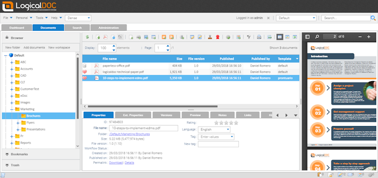 LogicalDOC is a cloud-based document management platform which stores all company documents in a centralized repository and enables teams to create, collaborate on, and manage any number of documents. System features and capabilities include drag-and-drop document upload, optical character recognition (OCR), forms management, barcode recognition, duplicate detection, document archiving, event logging, integrated document workflow, and more.
