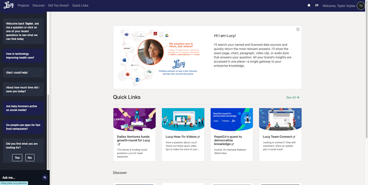 Lucy is a cloud-based, AI-powered knowledge management solution that helps knowledge workers across all industries. Not only does she bring you to the exact spot in your data asset where the answer lives, she doesn't require you to move your data--instead she operates with your data where it lives without disrupting internal systems and processes.