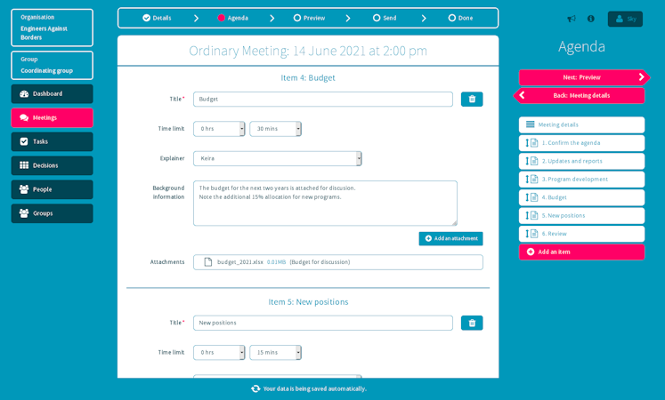 Meetniq makes it quick, easy, and painless to produce great minutes. Agendas automatically create minutes templates, capture decisions, and tasks during the meeting, tasks are summarised in their own section. Other documents can be attached too.
