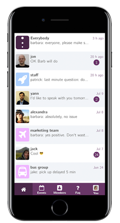 Minsh is a platform that generates white label apps for its customers. Each app includes 4 main customizable features: instant messaging, event calendar, member directory, and an additional page to incorporate a custom feature, for example sponsors, promotions, documents, FAQ, etc.