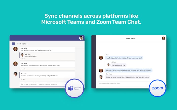 Mio allows users to keep their workforce in sync by connecting channels and direct messages across Microsoft Teams, Slack, Webex, and Zoom Team Chat.