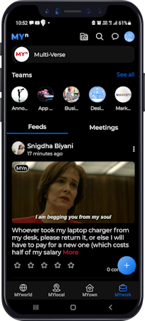 MYwork is a platform that enables your employees to collaborate and communicate seamlessly. A plug-n-play structure at its core, MYwork is a digital ecosystem that creates a unified experience for your employees. They get 100 GB storage, chat, group calls, feed, meetings and so much more.. all at a price that inspires scale and a healthy ROI.