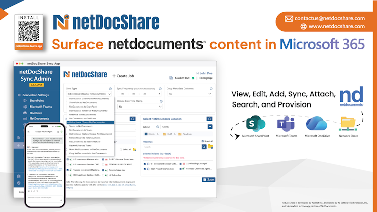 netDocShare allows Secure, lightning-fast NetDocuments to SharePoint / Teams / OneDrive / Network File Shares integration with advanced sync & Microsoft Teams lifecycle management.
