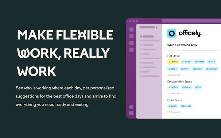 Officely makes flexible work, really work. See who is working where each day - whether they are in the office, at home or travelling. Get personalized suggestions for the best office days and arrive to find everything you need—from a desk to your lunch order—ready and waiting. All in Slack.
