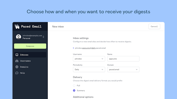 Use personalised or anonymous Paced Email addresses to buffer yourself from messages until you want them. Batch by day, week or month into convenient digests.