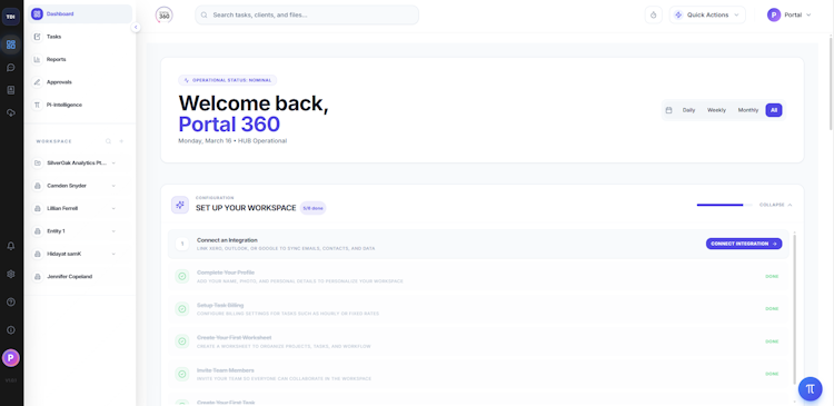 Portal360 delivers a comprehensive suite of capabilities centered on intelligent workflow automation and unified communication management. A centralized inbox aggregates emails, chat messages, documents, CRM notes, and client history into a single interface to maintain full context across client interactions. The system includes context aware artificial intelligence that manages queries, interprets conversations, and surfaces relevant information automatically to minimize manual follow up and accelerate response times. End to end workflow management enables configurable approval flows, automated task assignments, and real time visibility into workload distribution and deadlines. The platform supports worksheet creation to organize projects, task billing configuration with hourly or fixed pricing options, and practice wide analytics for productivity metrics, bottleneck identification, and team capacity tracking. Role based access controls and permission management maintain data security while ensuring appropriate information accessibility. A document management system offers centralized storage with ownership tracking and version history. Entity management capabilities allow firms to create and maintain client and entity records with linked documentation and compliance context. A mobile application for iOS and Android devices enables remote access for teams and clients.