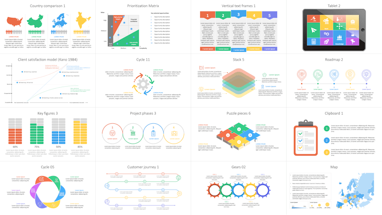 Stop reinventing the wheel: easily search the content Library. It contains 500 PowerPoint templates, 7,000 icons, all country flags, 350 data maps, advanced charts, a million pictures, company logos... everything you need to create impactful AND beautiful documents in minutes. Customize it with your brand, colors, fonts and logo, and integrate your own resources such as your company pitch deck, CVs of your team, credentials, case studies and more.