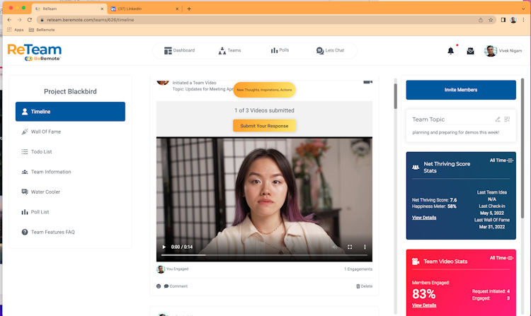 ReTeam is an all-in-one platform designed to boost team participation, idea sharing, engagement, and wellness. These pillars create more cohesive and productive teams.
