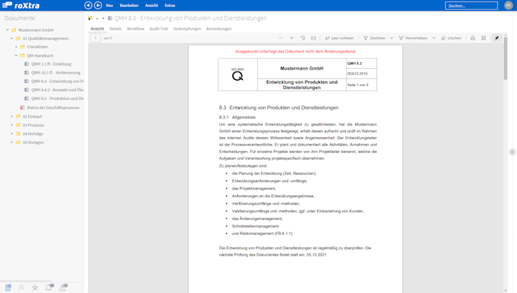 Benefit from the user-friendly and intuitive user interface and an individual document workflow with clear approval and control processes as well as from the automatic and revision-proof versioning and archiving of your QM documents. Thanks to the fast and integrated full-text search, you always have an overview of where which document is located. With roXtra, steering and control is easy over the entire document life cycle.