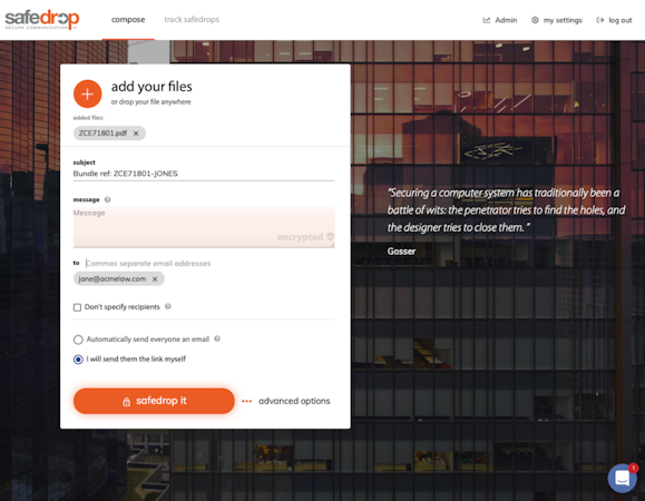 safedrop is a secure file and message delivery platform used by law firms, banks, healthcare providers, governments, and professional service teams worldwide. Built for sensitive data, it’s compliant with GDPR, HIPAA, and NIS2, and supports up to 100GB per transfer.