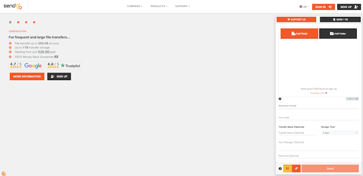 SendGB Extra: A premium annual subscription for power users. It provides up to 1 TB of storage and allows large transfers (up to 500 GB) without expiration during the membership.