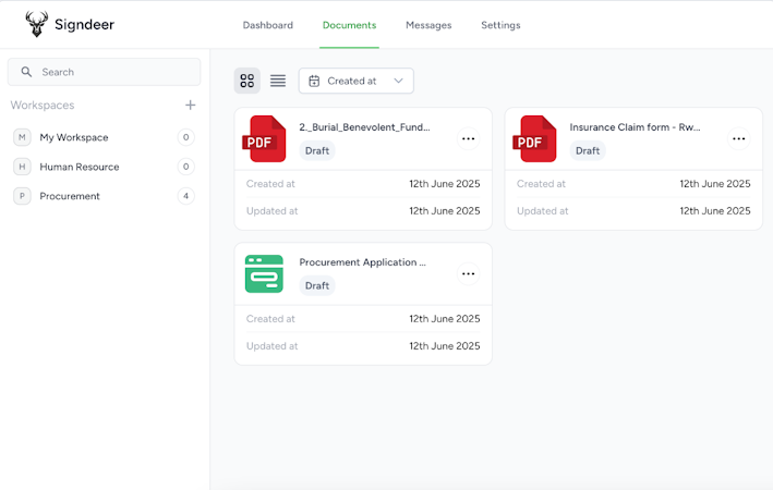 Chasing documents through email or WhatsApp is chaotic. Signdeer allows you to send branded, automated document request links to clients and partners. You can track submissions in real time, send reminders, and organize uploads with built-in validation and structured checklists — ideal for SACCOs, law firms, municipalities, and financial services.