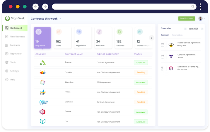 SignDesk enables businesses to digitize onboarding & KYC verification from end-to-end, switch to holistic and centralized contract governance, and accelerate document execution using secure e-Signatures. SignDesk is compliant with 12+ certifications, including GDPR, SOC 2, CCPA, HIPAA, FERPA, Gramm-Leach-Bliley Act, and 5 ISO compliance certifications.
