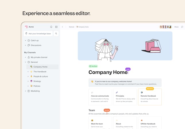 Slite is the fastest way to access trusted company information. Powered by AI, Slite’s knowledge base enables growing teams to instantly get the answers they need - without even searching. From onboarding guides to all hands notes, Slite keeps all types of company information centralised in one place. Docs stay organised, can be verified, and are tracked so everyone can get on with their work, informed. Replace all-in-one workspaces with a tool built for company knowledge and see it scale with your team. Join more than 200,000 companies that use Slite as their single source of truth today.