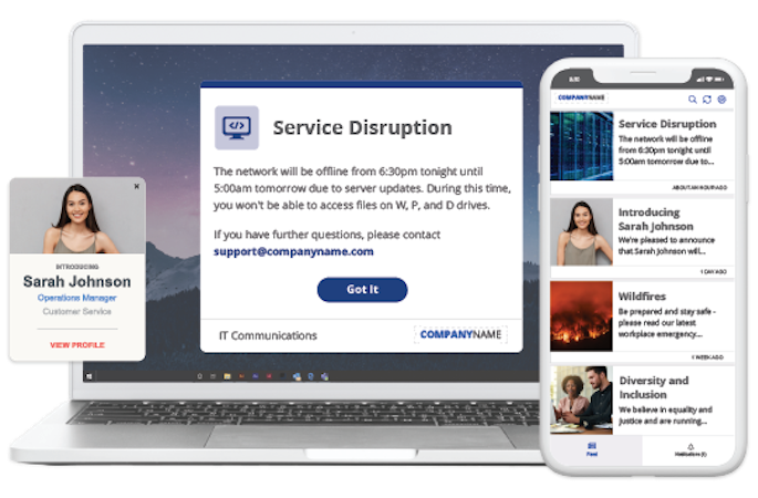 - Desktop (and mobile) Alert messaging for a range of communications from urgent to engagement messages for employees