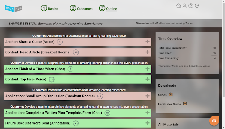 Soapbox is an award-winning rapid authoring tool for facilitated training. Soapbox makes it easier and faster to create more effective training programs and presentation. Soapbox builds a custom presentation from 1000's of activities and generates a facilitator guide, slides, and handouts that make it easier to go from training need to training solution.