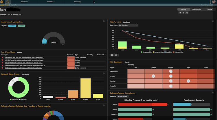 SpiraTeam® provides reporting dashboards of key project quality and progress indicators - requirements test coverage, task progress, project velocity, test execution and top risk and issues – in one consolidated view that is tailor-made for agile methodologies as well as supporting your legacy/hybrid waterfall projects.