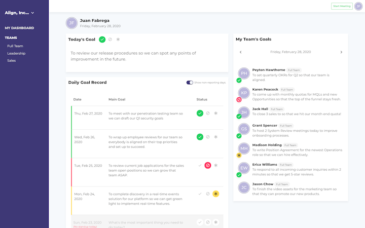 Product is easy to use and makes it simple for our team to input and review daily goals in under 15 minutes each day.