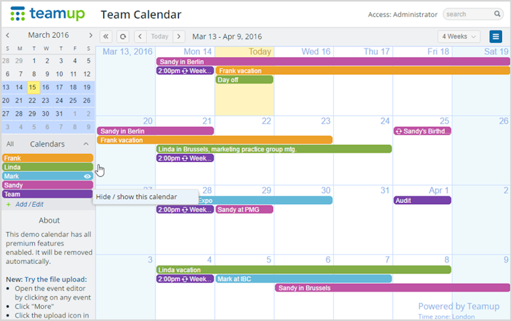 Teamup is intuitive and simple to use. No user accounts are required. All that is needed to access Teamup Calendar is a web link.