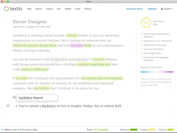 Textio is an augmented writing platform designed to help businesses improve the quality of recruiting content across job sites, emails, and employer blogs using editing, scoring, and analytics tools. It provides a central library, which lets recruiters create document writing and sharing workflows to review, approve, and publish content on a centralized platform.