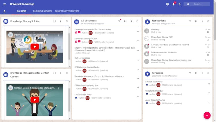 Universal Knowledge by Knowledge Powered Solutions is a knowledge management system which provides solutions for contact centers, help desks, internal knowledge management, and web self-service portals. The software can be integrated with ITSM (IT Service Management), help desk, CRM systems, websites, self-service portals and social media channels.