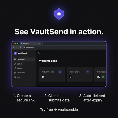 VaultSend is a secure data collection and sharing platform designed for professionals who manage sensitive client information such as accountants, lawyers, IT specialists, human resources teams, immigration consultants, and business consultants. The software employs time-limited encrypted links to facilitate the exchange of confidential materials without relying on email. VaultSend automatically deletes data after link expiration to minimize long-term storage risks and address vulnerabilities associated with traditional document transfer methods.