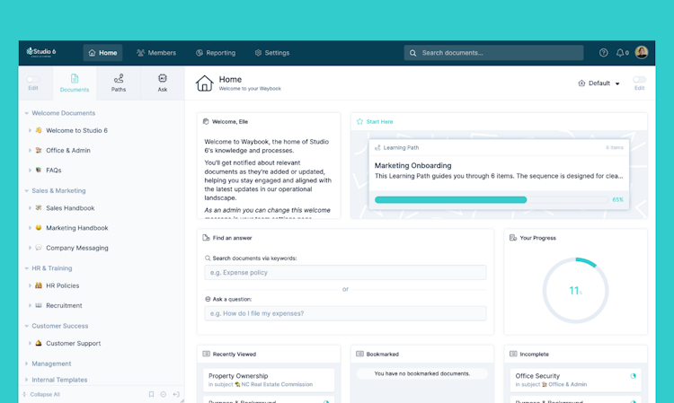 Waybook is a tool that turns documents, processes, and knowledge into effective and organized onboarding, training, and reference materials. It is a business playbook that stores all documentation in one convenient place.
