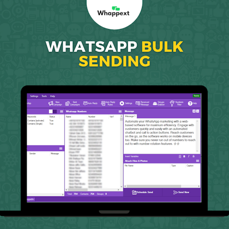 Automate your WhatsApp marketing with Whappext software for maximum efficiency. Engage with customers quickly and easily with an automated chatbot and call-to-action buttons. Reach customers on the go, as the software works on mobile devices too. Make sure you never run out of numbers to reach out to with number rotation features. Key features include: - Unlimited messages - Multimedia support - Image with caption - Multi-channel support - Customized messages - Video support - Multiple accounts supported - Whatsapp business product or service catalogue - Numbers filter - Groups contacts extractor - Advance settings - Multi-language - Auto reply - Dynamic chatbot - Group posting - Message scheduling - Import from WhatsApp The software is designed to deliver results, helping you enhance customer engagement, boost sales, and strengthen brand presence. Navigate the platform with ease, even if you're new to WhatsApp marketing. Its user-friendly interface ensures a smooth experience for every user.