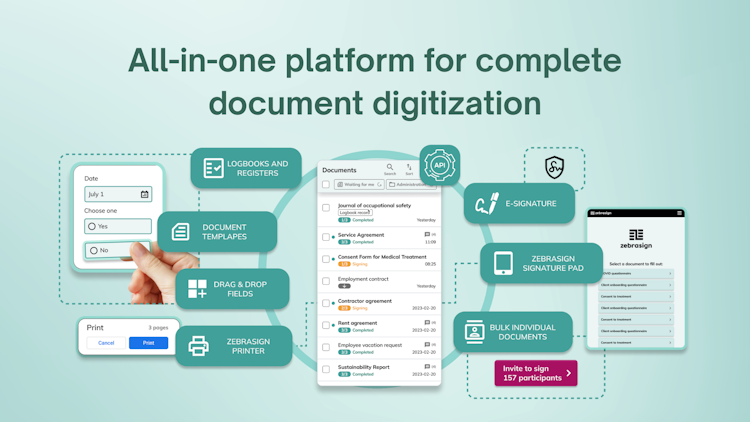 ZebraSign is an electronic document and eSignature platform designed to streamline document management processes for businesses of all sizes. The software provides a cloud-based solution for electronically signing, securely storing, and organizing documents online. ZebraSign caters to a diverse range of industries and organizations seeking to digitize their document management systems, from small businesses to large corporations requiring advanced document handling capabilities. The platform functions as an all-in-one solution for complete document digitization, allowing users to sign, fill, and manage documents on tablets, in electronic logbooks, or directly within existing business systems.