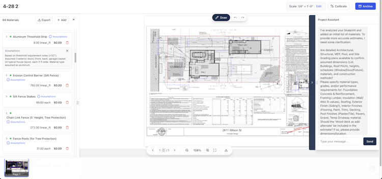Autotakeoff is a cloud-based construction takeoff software that automates and streamlines the material estimation process by calculating material quantities from construction plans. The software uses artificial intelligence to analyze uploaded building plans and generate accurate material quantities.
