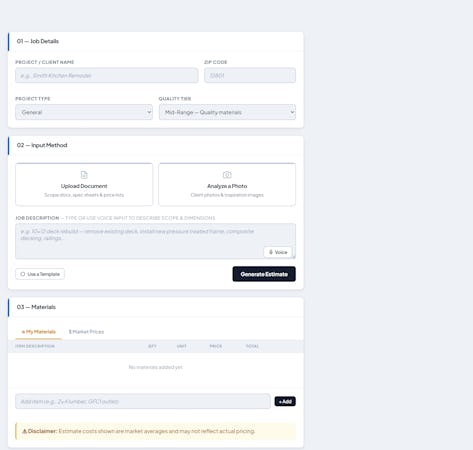 Estimate Assistant operates as a cloud-based, browser-accessible platform requiring no software downloads or installations. It functions on Chrome, Safari, Firefox, and Edge browsers across desktop computers, tablets, and smartphones. The mobile-responsive design permits estimate creation and adjustment from job sites, vehicles, or office environments without device-specific limitations. The AI engine has been trained on construction industry data to generate initial material lists by checking user-defined pricing databases before defaulting to market average values. The platform accommodates a range of project complexities, from quick ballpark figures for initial discussions to detailed breakdowns for formal bidding processes.