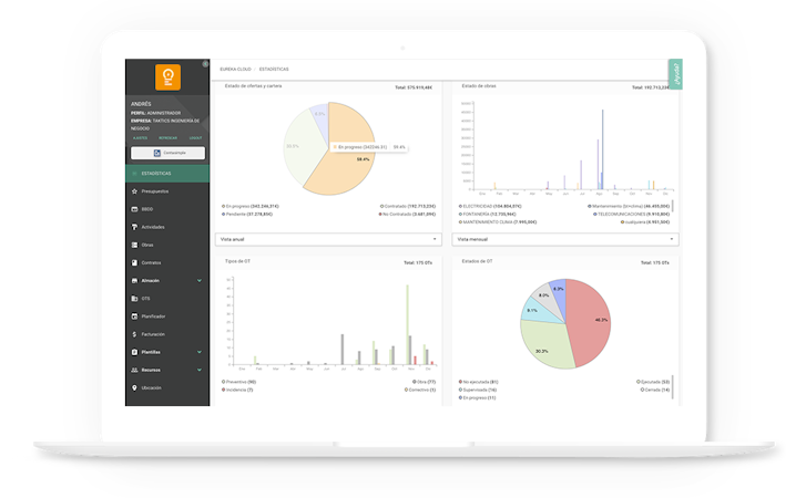 Eureka Cloud is an ERP where you have everything you need to organize and systematize the workflow of your company, including digital work reports that allow you to forget about documentation and paperwork. Organize tasks and your team with a single tool. Eureka Cloud is in the cloud; you can control everything from anywhere in the world.