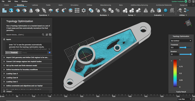 The multilingual software provides topology optimization technology for significant weight reduction enhancements without compromising the product's performance. Its parameters and rerun of the workflow yield new design variations and lightweight parts optimized for the engineer's specific needs. Additionally, nTopology enables designers to access 3D printing overhang angles, multiple support regions, and export designs in a file for 3D printing. It minimizes material usage and production costs.