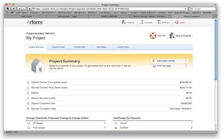 The web based construction contract administration tool allows architects to create and issue important change orders, request for information (RFI) forms, progress claims, and site instructions. All forms include history tracking and are stored within the rform app for easy retrieval. Forms are also automatically logged and numbered as they are created with aspects such as liens, holdbacks, and taxes calculated automatically.