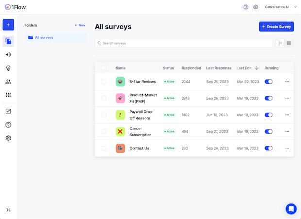 1Flow lets users measure NPS, CSAT, CES, and PMF scores. It helps collect feature-specific feedback and determine the reason for churning away from the product.