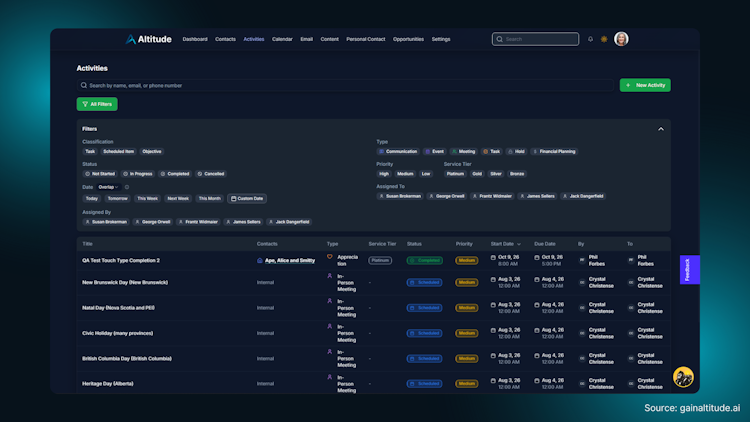 Altitude CRM is the next-generation AI-native platform designed to help financial advisors manage every part of their business in one place. It combines client relationship management, marketing automation, and practice management with a modern, intuitive interface and built-in intelligence that learns from advisor activity. The result is a single, integrated workspace where firms can organize clients, track opportunities, automate tasks, and make decisions with confidence.