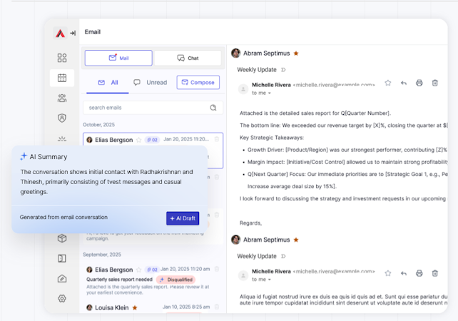 The unified conversation engine aggregates messages from email, business messaging channels, text messaging, and voice calls within the CRM interface and automatically logs all interactions and recordings. The email management module centralizes multiple inboxes and applies smart filters and notifications to track messages, replies, and attachments without switching applications. Integrated calling and messaging features allow calls and text messages to be placed directly from the platform while capturing call details and recordings for complete customer records. Calendar management tools coordinate scheduling based on team availability and role assignments, and task and appointment tracking provides a single view of daily activities, deadlines, and priorities. AI-enhanced productivity assistants support communication refinement, note clarity, and task optimization, and marketing automation sequences trigger personalized email campaigns based on customer engagement metrics. Flexible tagging capabilities enable custom data categorizations for targeted campaign segmentation, specialized reporting, and database filtering. The integrated website builder enables the creation and management of digital properties without coding requirements. Real-time reporting dashboards present performance insights, trend analysis, and team activity monitoring to support data-driven decision making.