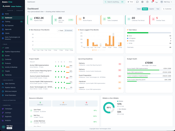 Avaro One is an integrated customer relationship management and professional services automation platform that unifies sales pipeline management, project delivery, time tracking, invoicing and resource planning in a single system. It serves consulting firms, managed service providers and advisory practices by addressing the need for a cohesive solution that spans the entire client lifecycle. The platform resolves the common problem of siloed data and disconnected processes that arise when separate sales and delivery applications are employed.