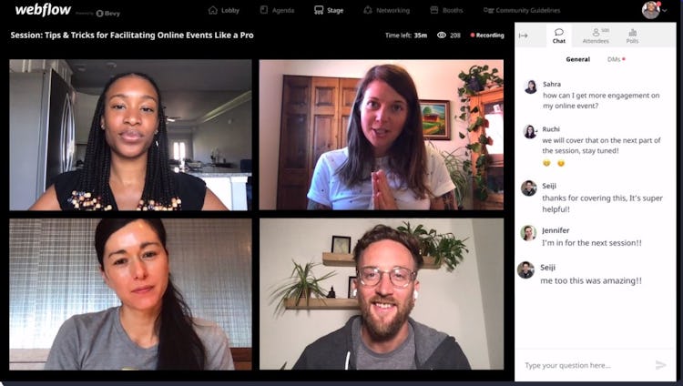 Bevy is a virtual event management software designed to help event managers, speakers, sponsors, local organizers, community members, and conference planners organize webinars and workshops or join communities. Key features of the platform include auto check-ins, live streaming, private sessions, closed captioning, single sign-on (SSO), and permissions management.