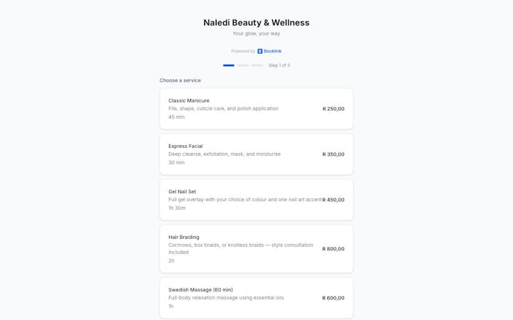 Booklink is a cloud-based appointment scheduling and booking management software tailored for solo service providers and small businesses in South Africa. It enables service-based businesses to accept bookings and process payments through a single shareable link, eliminating manual appointment coordination via messaging applications. The platform addresses the requirements of hair salons, barbershops, beauty therapy practices, massage therapy clinics, personal training services, photography studios, tutoring businesses, consulting firms, cleaning services, and driving instruction schools. The software is developed and maintained by Tora Technologies in Cape Town and operates on a freemium model offering a permanently free tier and a paid tier for unlimited bookings.