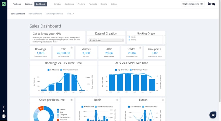 Briq Bookings is a cloud-based appointment scheduling platform, which helps small to large businesses in the leisure, travel, and tourism sectors manage online bookings, customize guest itineraries, process payments, and schedule recreational activities. It provides several features including custom webshop, KPI monitoring, group reservations, data insights, and cross-selling.