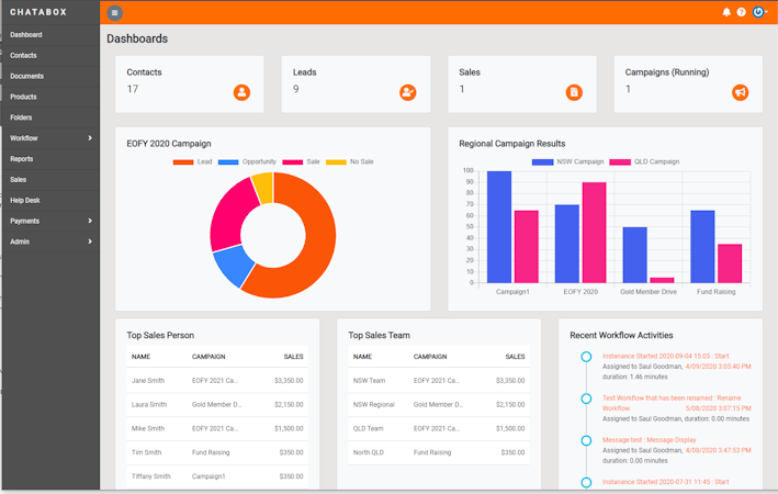 Chatabox allows users to schedule one-time or recurring reminders and appointments, add private or public notes with digital signatures, maintain a client database, and generate and share invoices with clients. Users can also gain insights into recent sales, tasks, project progress, campaign performance, and opportunities via a centralised dashboards. The dashboards are customisable.